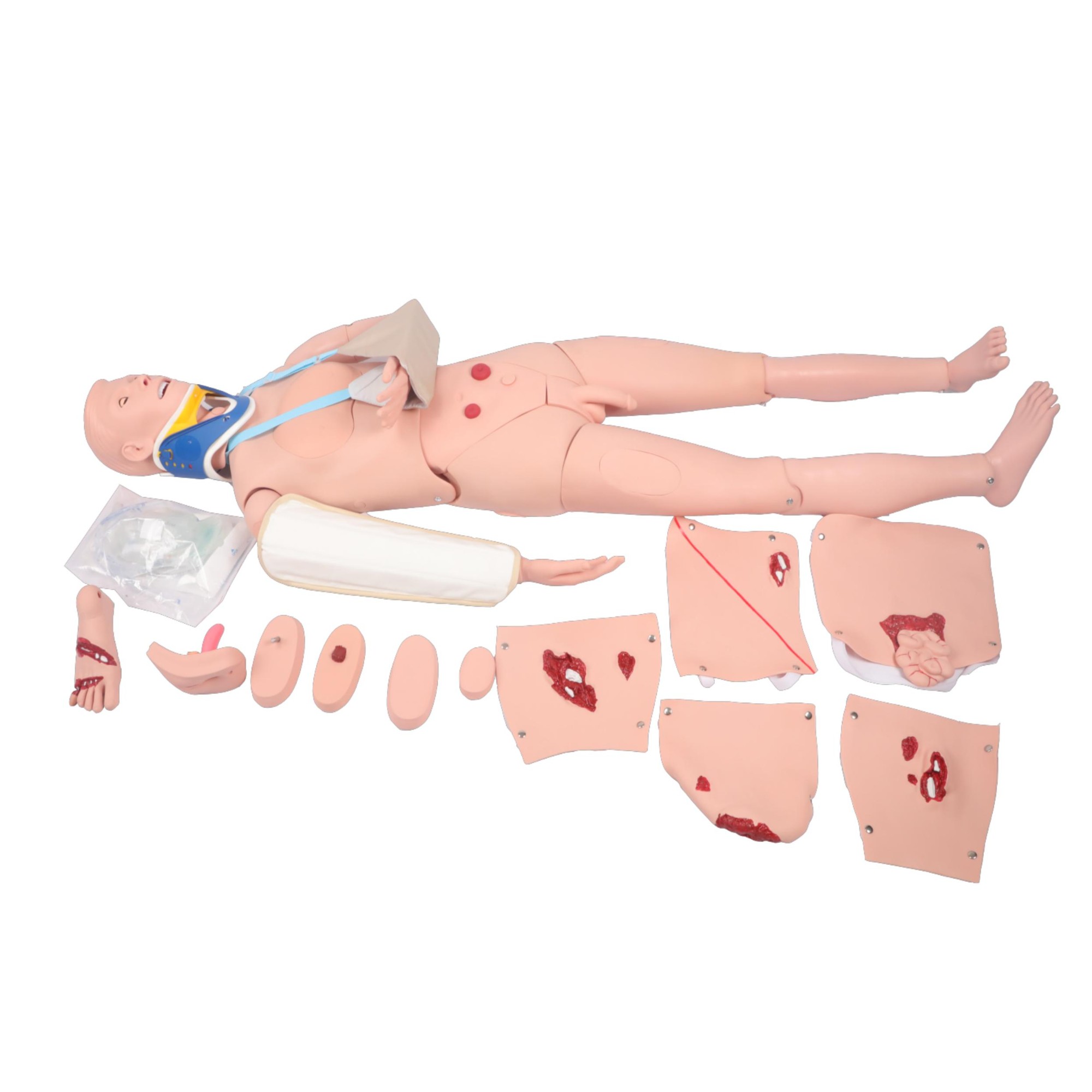 本產(chǎn)品是一款高端整體仿真護(hù)理人模型,適用于急救教學(xué)與實(shí)踐操作。模型可擺放成多種操作體位,具有高度仿真性。功能特點(diǎn)包括上肢肱骨上段和下肢脛腓骨下段的閉合性骨折模擬,用戶可觸及骨折斷端,體驗(yàn)成角畸形和骨摩擦感。此外,模型兼容所有骨折支具,為醫(yī)護(hù)人員提供逼真的骨折處理訓(xùn)練環(huán)境。