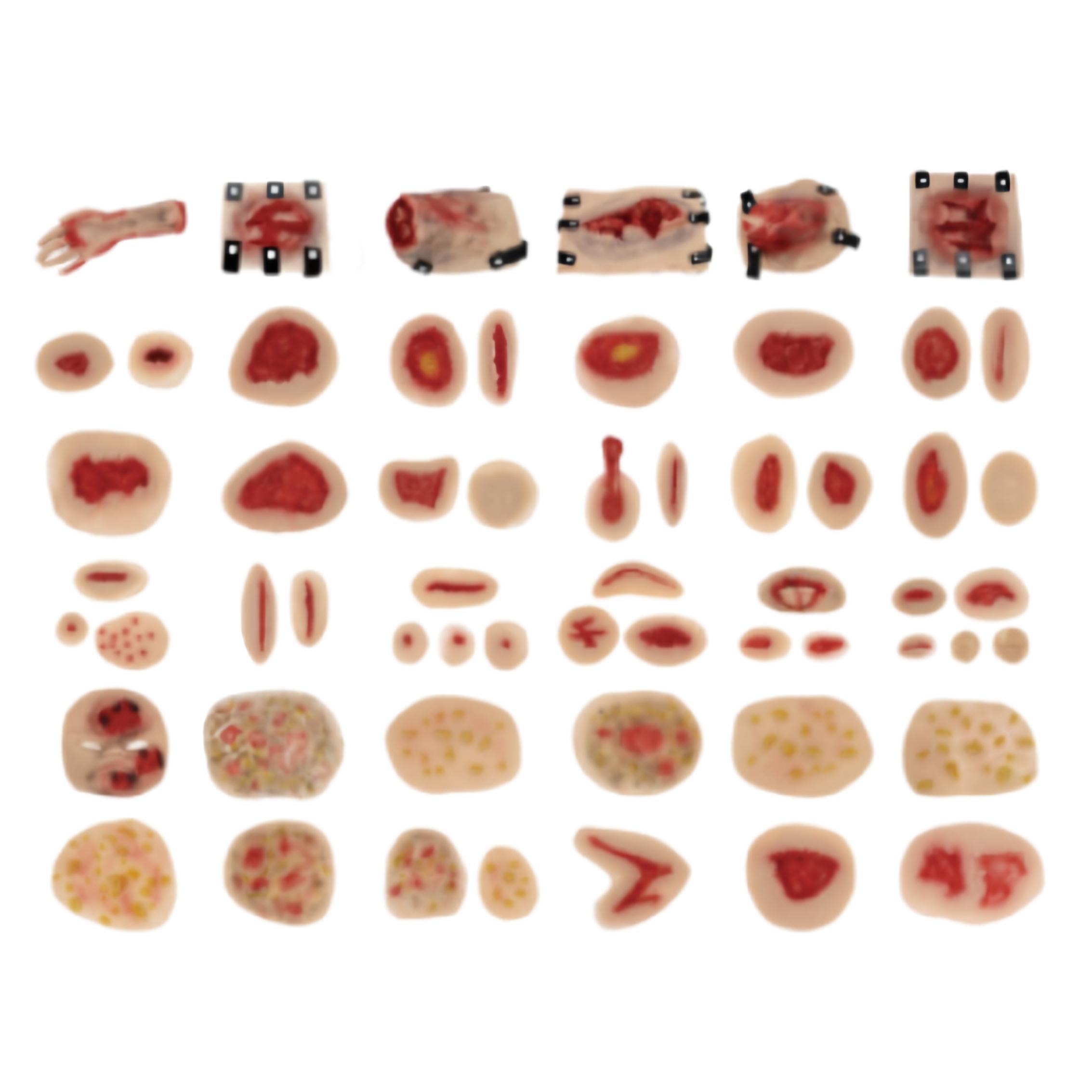 該產(chǎn)品圍繞傷口識別、止血等基本技能展開,產(chǎn)品特點突出,其呈現(xiàn)出豐富多樣的創(chuàng)傷類型,包含彈傷、燒傷、槍彈傷、撕脫傷、撕裂傷等眾多類型,從閉合性骨折到開放性骨折,從刃器傷到鈍器傷,還有腸膨出、眼球突出、手部離斷等各類情況,為掌握戰(zhàn)傷急救等技能提供了極為全面、逼真的模擬場景,利于訓(xùn)練實操能力
