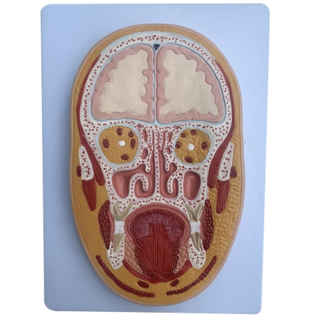 該模型顯示了頭部額部穿過顱骨、額腦、左右眼眶、鼻腔、咽腔和口腔。