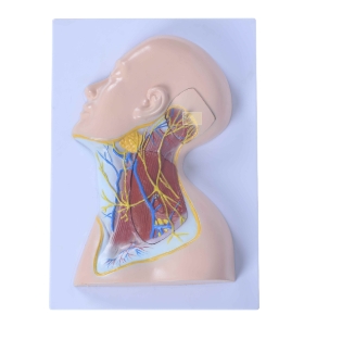 該模型顯示了頸部淺表結(jié)構(gòu)、淺靜脈、神經(jīng)、肌肉和淋巴結(jié)的皮膚解剖結(jié)構(gòu)。還有脖子的子區(qū)域,真人大小。材質(zhì):PVC包裝:2 件/箱,46x32x24cm,6 公斤