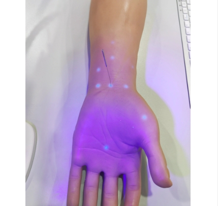 模型仿照正常手部比例大小,表皮采用特殊硨膠材質,內置真實骨骼肌肉,可彎曲,體表特征明顯,模型上有大于50個穴位可以和系統(tǒng)進行交寫操作。