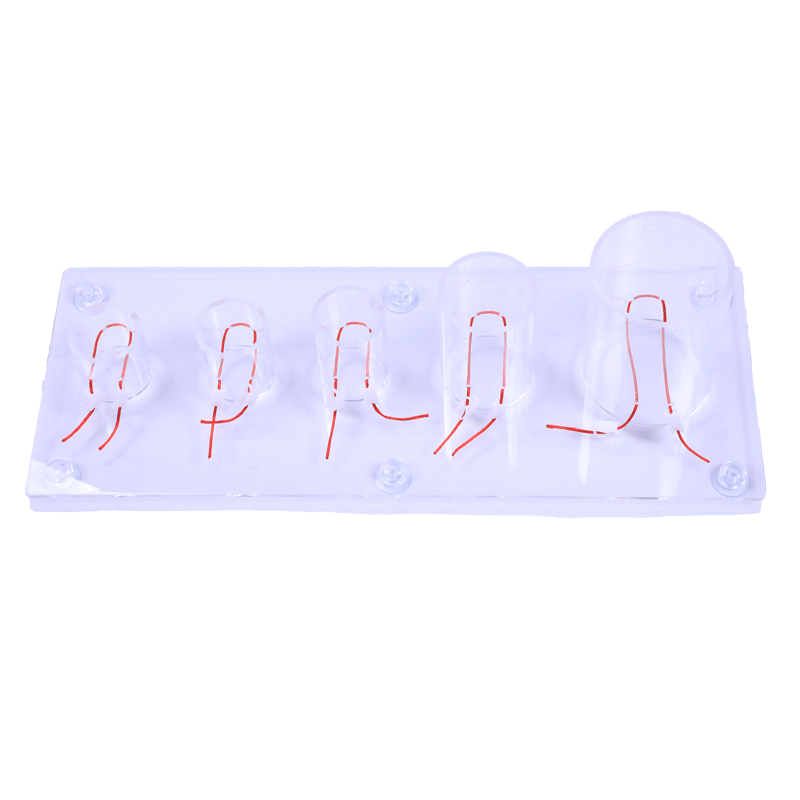 功能特點(diǎn): ■ 由透明材質(zhì)制成,五種不同大小的圓柱體構(gòu)成不同的打結(jié)空間?!?打結(jié)方法:?jiǎn)问执蚪Y(jié)法、雙手打結(jié)法、器械打結(jié)法;■ 打結(jié)種類:?jiǎn)谓Y(jié)、方結(jié)、三重結(jié)和外科結(jié),辯論假結(jié)、滑結(jié);■ 模擬多種打結(jié)環(huán)境:如外科結(jié)小切口打結(jié),腹腔、盆腔深部打結(jié)、大切口深部有角度打結(jié)等。
