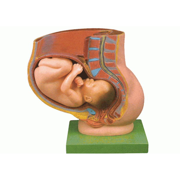 該模型由骨盆子宮和妊娠九個月胎兒兩個部件組成,并顯示子宮、陰道、膀胱、直腸和胎兒、羊膜、胎盤、臍帶等結(jié)構(gòu),共有38個部位指示標(biāo)志。