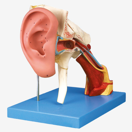 博友BLM17202耳結(jié)構(gòu)放大模型由耳廓、外耳道、中耳鼓室、鼓膜和聽小骨、顳骨巖部、內(nèi)耳迷路和咽鼓管等8個(gè)部件組成,并顯示外耳、中耳鼓室、鼓膜和聽小骨、咽鼓管、顳骨巖部和內(nèi)耳迷路等結(jié)構(gòu)。