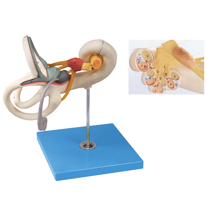 博友BM1185內(nèi)耳迷路放大模型該模型由內(nèi)耳迷路(包括骨迷路和膜迷路)以及沿耳蝸縱軸剖開的耳蝸縱剖面等兩個(gè)部件組成,可顯示打開的上半規(guī)管、內(nèi)耳前庭球囊、橢圓囊以及耳蝸縱剖面和前庭、耳蝸神經(jīng)等結(jié)構(gòu),共有25個(gè)部位指示標(biāo)志。