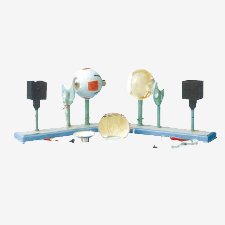 由成人眼球、光源、校正鏡片、活動成像顯示屏及底座組成。通過眼球前后極在正中與水平成75度切面,示眼球壁三層被膜,眼球內(nèi)晶狀體(可改變曲率),玻璃體和虹膜。由外向內(nèi)三層被膜做成梯形切面,并示其各部結(jié)構(gòu)。