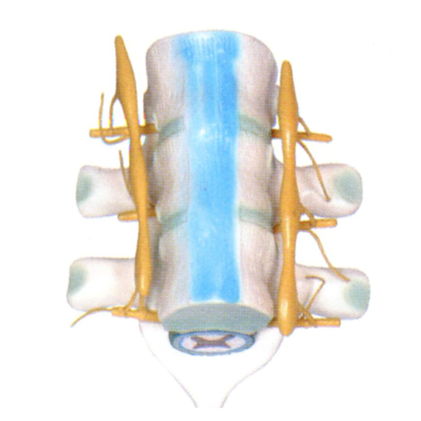 模型中二個(gè)胸椎和四對(duì)脊神經(jīng)組成作圓柱體貫穿于椎管中,在脊髓橫切面上可以觀察位于中央的蝶形構(gòu)造的灰質(zhì)和包圍在它四周的白質(zhì)。