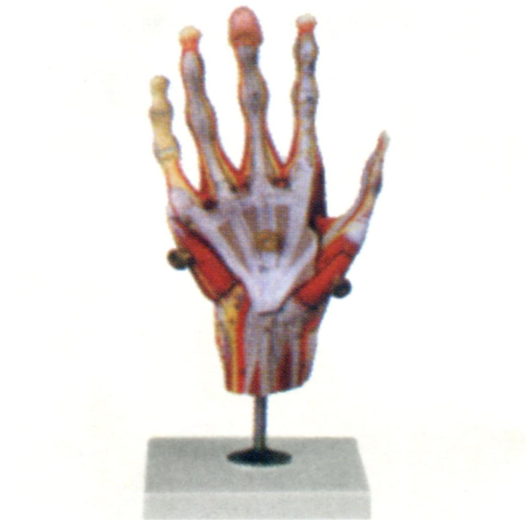 博友BM1302手肌附主要血管神經(jīng)模型由手肌、掌腱膜、魚際、小魚際和蚓狀肌等5個部件組成,并顯示手肌分層、手骨、韌帶、肌腱及其主要血管神經(jīng)等結(jié)構(gòu)。 尺寸:自然大,22.5×13.5×5.5cm