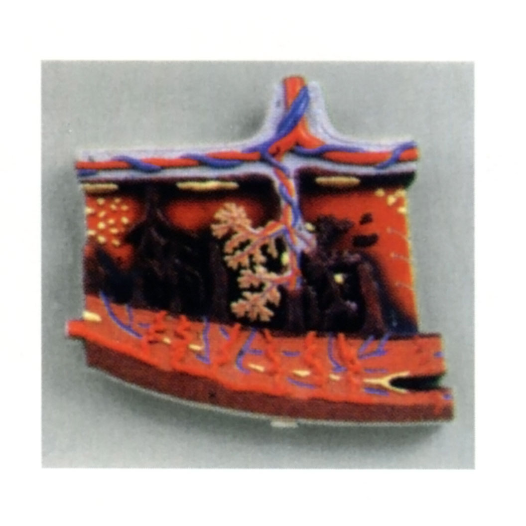博友BM2049胎盤組織放大模型顯示胎盤組織結構羊膜上皮、叢密絨毛膜、絨毛干、絨毛、細胞滋養(yǎng)層殼和基蛻膜以及臍帶等結構,胎兒臍血管紅色為臍靜脈,蘭色為臍動脈,母體子宮血管,紅色為子宮螺旋動脈,蘭色為子宮靜脈,共有14個部位指示。