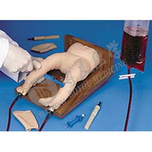 Life/form® Intraosseous Infusion Simulator represents a six-month-old infant. Included with the simulator are 10 replaceable bone inserts, 2 sets of replacement leg skins, 2 white towelettes, syringe with tubing, blood powder, sealing wax, 1/2 oz. liquid lubricant, mixing bottle, needle, and hard carrying case. Three-year warranty.