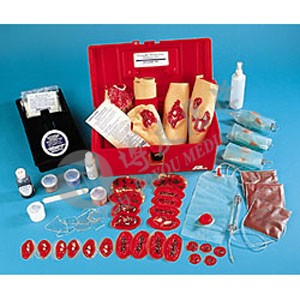 Make first aid courses an unforgettable experience, and add realism to your training exercises! A "hands-on" kit designed for all levels of flrst aid training. Contains simulated wounds of the most commonly found injuries, and teaches students to recognize and properly treat these wounds in an emergency. Contains 24 assorted replicas of various fractures, lacerations, and wounds. Each replica can be quickly and easily attached to "victims" with Velcro® straps. A generous supply of assorted makeup materials provides an even greater realism for your training exercises, along with five portable reservoirs with pumps to create actual bleeding wounds. Durable carrying case.