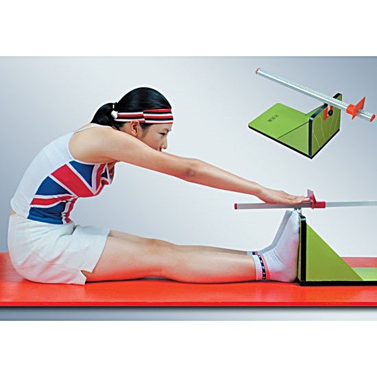 測(cè)定方法:受測(cè)者坐在連接于箱體的軟墊上,兩腿伸直,不可彎曲,腳跟并攏,腳尖分開約10-15cm,踩在測(cè)量計(jì)垂直板上,可視被試者腳的大小,用緊固螺絲調(diào)整尺寸的高度,然后兩手并攏,兩臂和手伸直,漸漸使上體前屈,用兩手指尖輕輕推動(dòng)尺上的游標(biāo)前滑,直到不能繼續(xù)前伸。測(cè)兩次,取最好成績(jī),記錄以cm為單位,精確到小數(shù)點(diǎn)后一位。