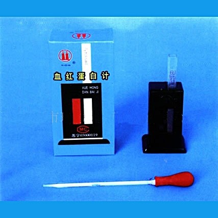 4、10分鐘后滴加蒸餾水進行稀釋。同時進行不斷地攪動混合,邊滴邊觀察色澤是否與標(biāo)準(zhǔn)黃褐玻璃色澤相同,至比色(稀釋)方管的色澤與標(biāo)準(zhǔn)黃褐色玻璃色澤相接近時,應(yīng)注意逐滴慢慢加入,以免衡釋過度,至顏色完全相同時,即停止滴加蒸餾水,此時觀察比色方管內(nèi)凹形液面最低處的刻度讀數(shù)數(shù)字,即為每100毫升血液中含血紅蛋白的克數(shù)!